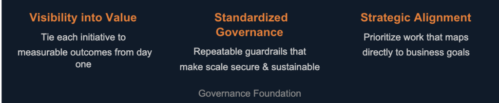 evolv designs and delivers AI transformation engagements that treat governance not as a final step, but as the foundation everything else is built on. Our approach is built around the three things that consistently move organizations from pilot activity to repeatable, production-ready delivery: visibility into value, standardized governance, and strategic alignment.