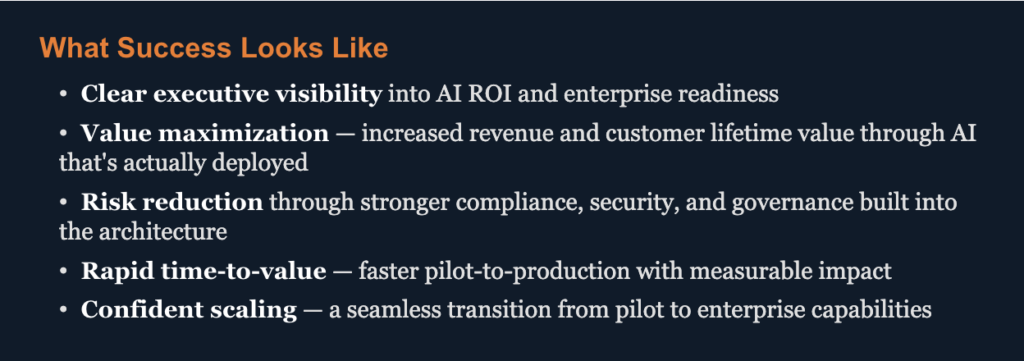 The goal isn’t a better pilot — it’s repeatable, production-ready delivery with a clear path to enterprise scale. That means walking away with a governance framework, a production roadmap, and the organizational confidence to treat AI as a strategic investment rather than a series of isolated experiments.