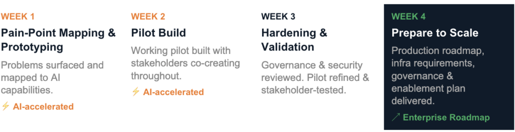 Week 4: Prepare to Scale: At the close of the engagement, organizations receive a clear, detailed roadmap covering production deployment, infrastructure requirements, governance frameworks, and organization-wide enablement. Leadership walks away with the visibility and confidence to make strategic resource decisions — and a concrete plan to execute them.