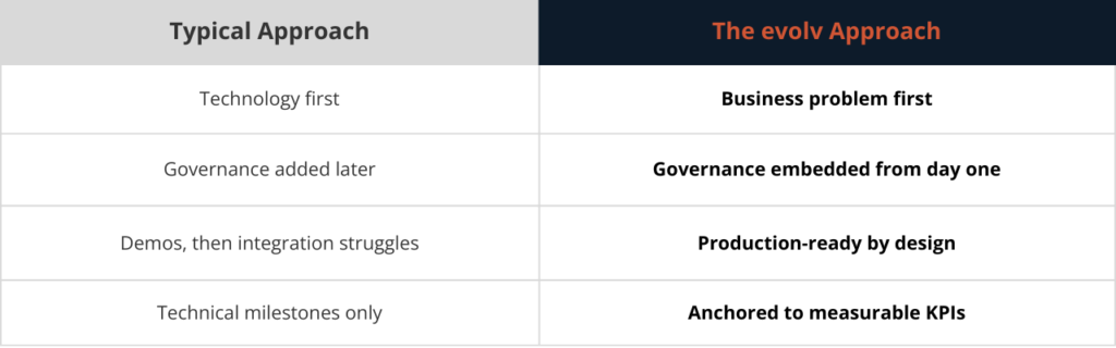 The difference between an AI pilot that scales and one that stalls often comes down to who built it and how. evolv brings a combination of capabilities that most consulting engagements don’t: